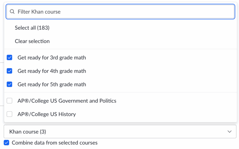 Improved filters and export options make it easier to analyze progress across courses, including Khanmigo AI activity in a single export.
